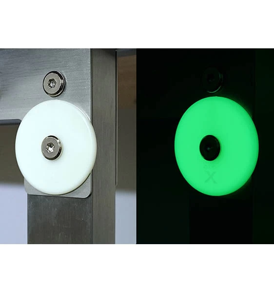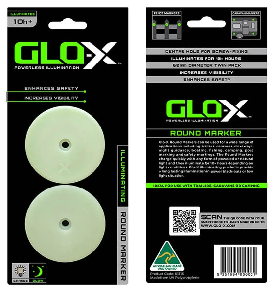 Glo-X Round Markers can be used for a wide range of applications including trailers, caravans, driveways, night guidance, fishing, boating, camping, post-marking and safety markings. Easily attachable by a screw, rivet or bonding. They charge quickly with any form of powered or natural light and then illuminate for 10+ hours depending on light conditions. Applied to stairs or hidden obstacles during low light periods or in the event of a power failure.Â