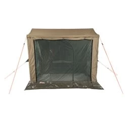 This panel has a large screened area with a zippered door made from superfine mesh. It also has a drop-down zippered canvas panel if it rains. This drop-down panel can also be used as an extra awning with the use of extra poles (poles not included).
